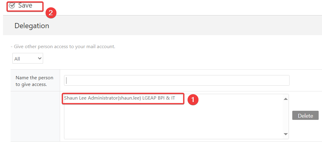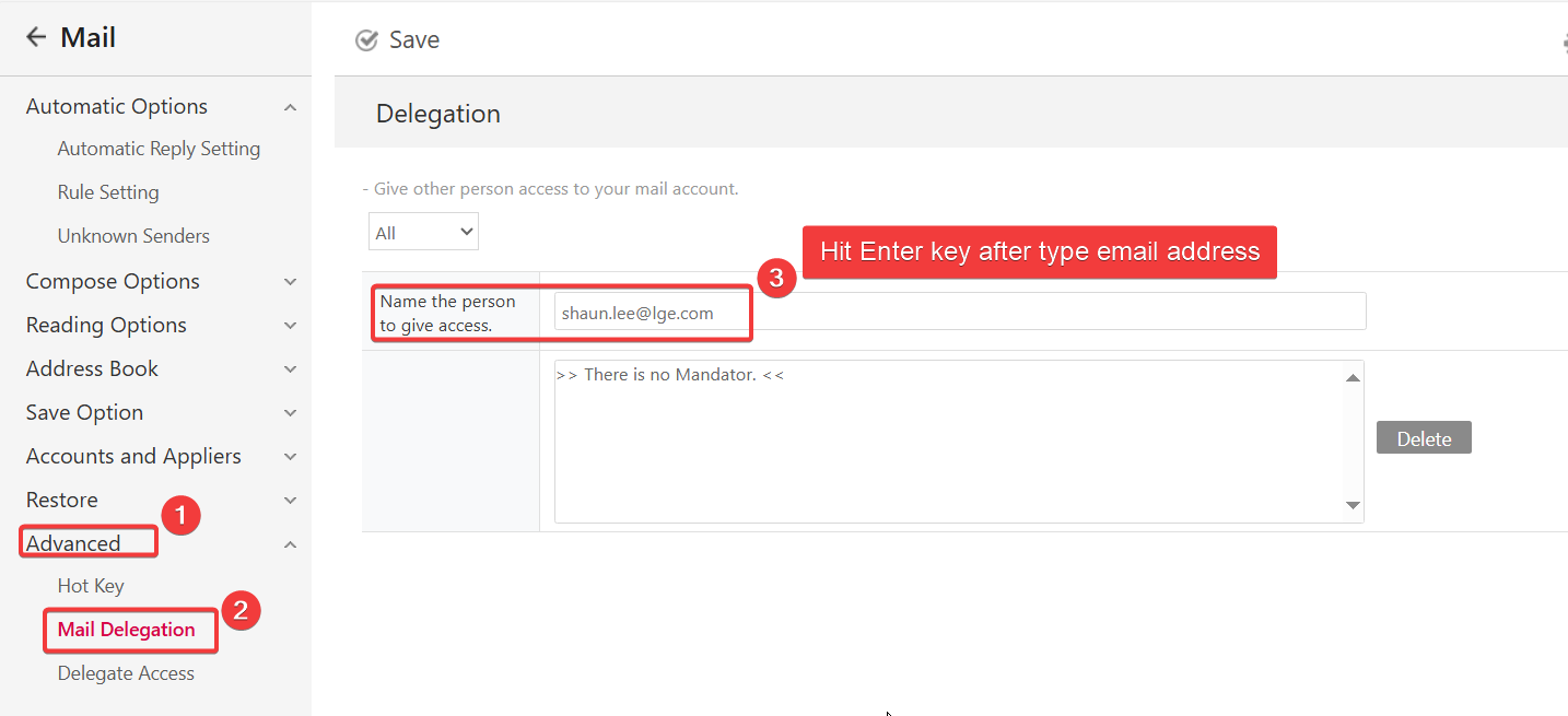 7. Go to Advanced - Mail Delegation option. and then type in the users who need to access this mail box.