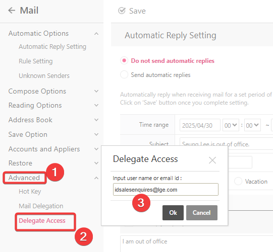 2. Go to Advanced - Delegate Access and then type in the email address to access and click OK.